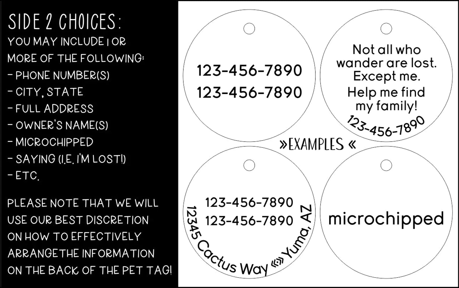 ◍ Single-Sided - Details will only be engraved on the front of the pet tag.