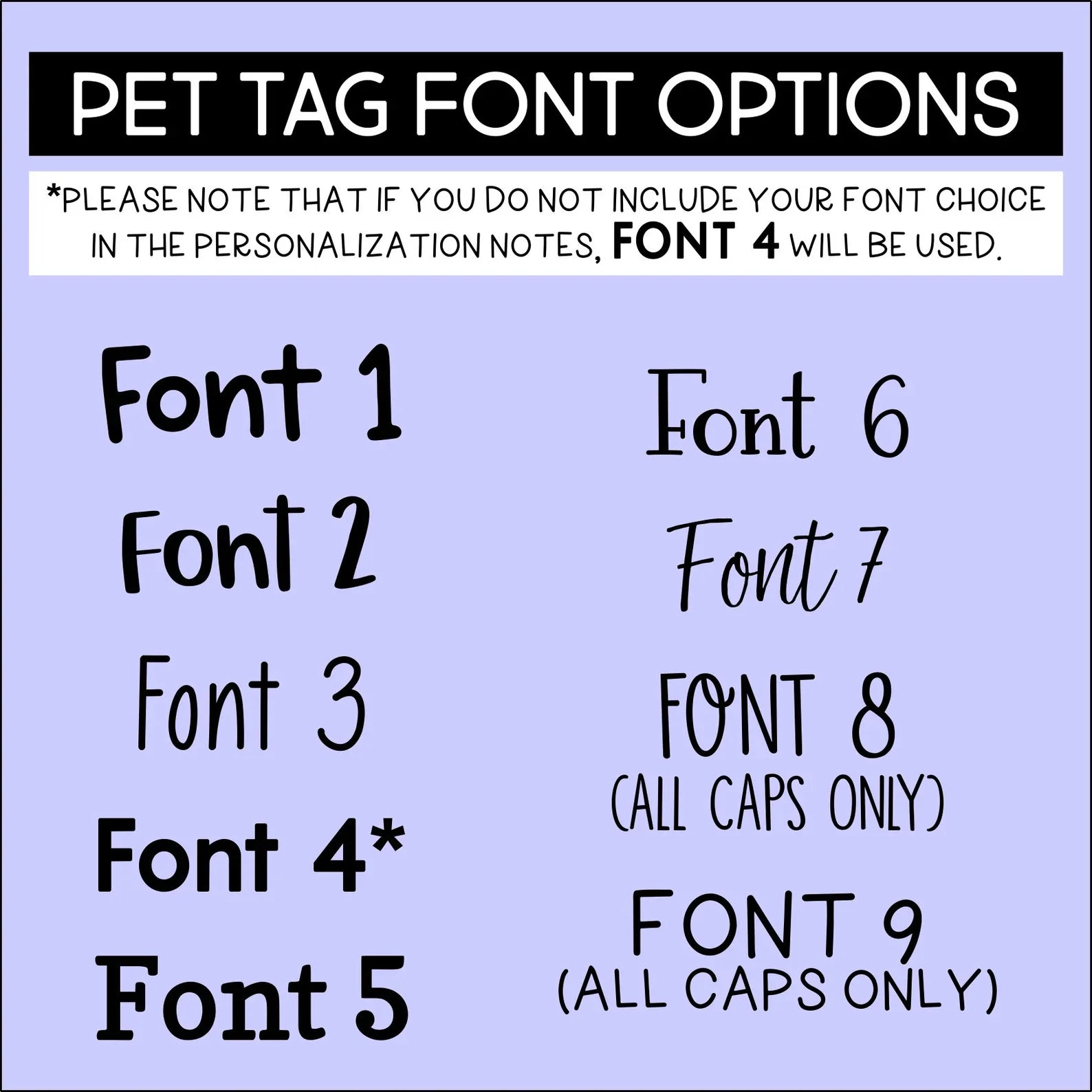 ◍ Examples of the fonts that we offer for the pet tags are shown (and numbered) in the the listing photos.
