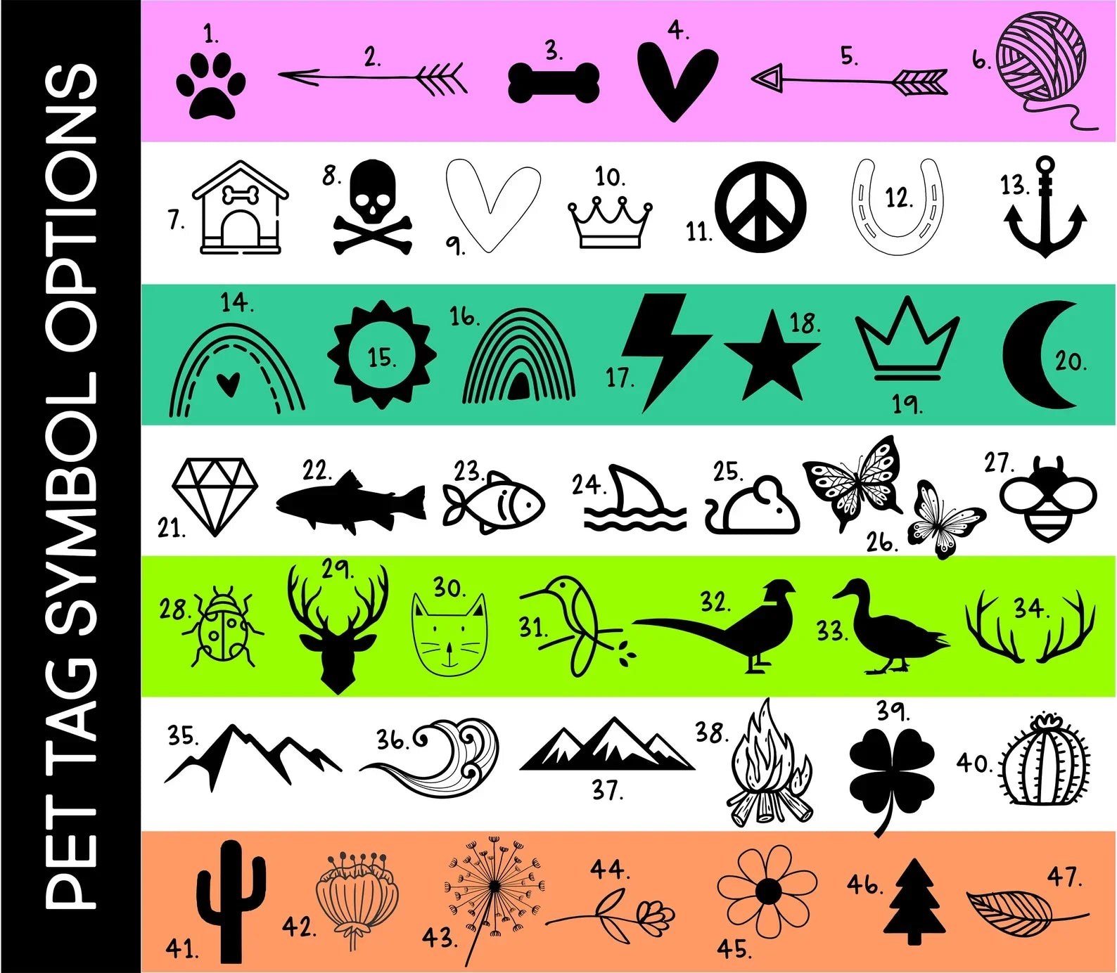 ◍ Examples of the symbols that we offer for the pet tags are shown (and numbered) in the the listing photos.